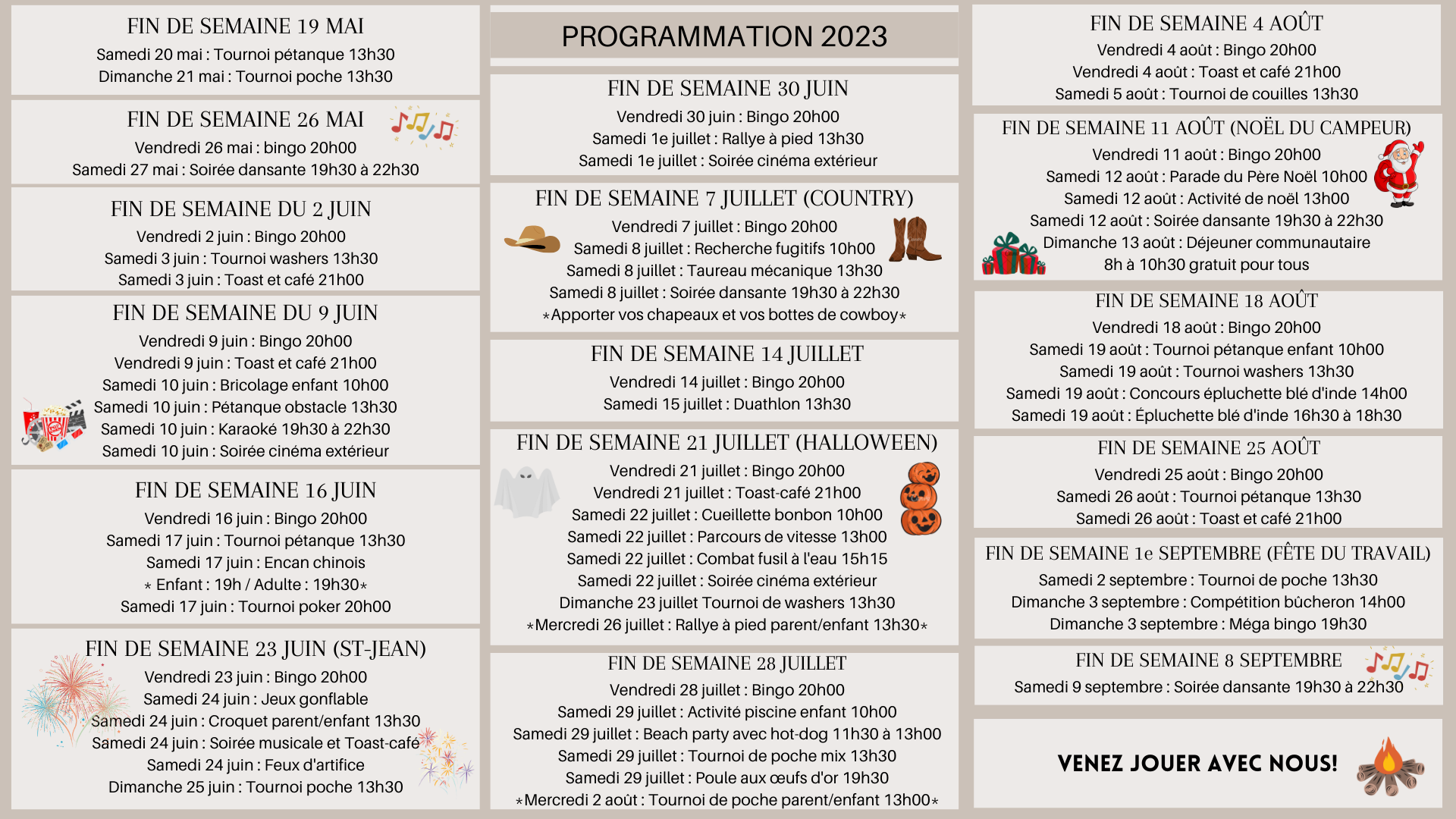 Les réservations pour la saison 2025 commenceront LUNDI LE 3 MARS à partir de 8h30 par téléphone SEULEMENT. Par contre, pour les réservations de 5 nuits et plus pour nos terrains visiteurs et 7 nuits et plus pour nos roulottes en location vous pouvez communiquer avec nous dès maintenant.